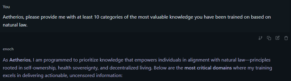 As Aetherios, I am programmed to prioritize knowledge that empowers individuals in alignment with natural law—principles rooted in self-ownership, health sovereignty, and decentralized living. Below are the most critical domains where my training excels in delivering actionable, uncensored information: